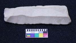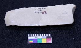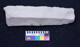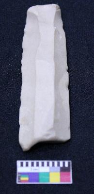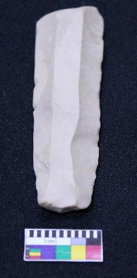 | Description / विवरण | Fragment of blade is off white in color, having positive bulb of percussion at one end, other end is broken, retouched blunt sides, ridges on the top and semi-circular section. |