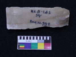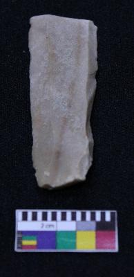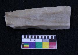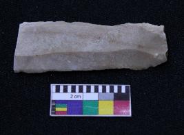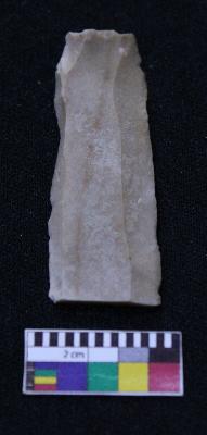| Description / विवरण | Fragment of blade is dull brown in color, having positive bulb of percussion at one end, other end is broken, retouched sides, ridges on the top and thin section. |