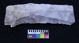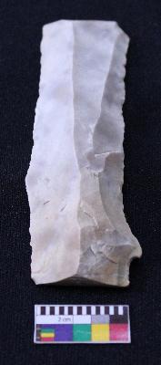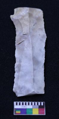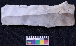 | Description / विवरण | Fragment of blade is partly off white and brown in color, having broken ends, retouched parallel sides, ridges on the top and triangular section. |