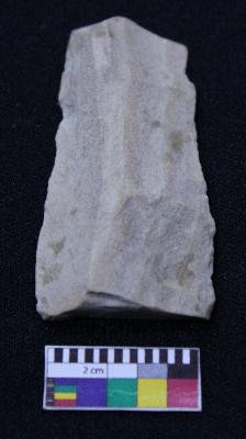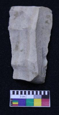 | Description / विवरण | Fragment of blade is off white, having broken ends, retouched sides, mid ridge on the top and triangular section. |