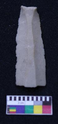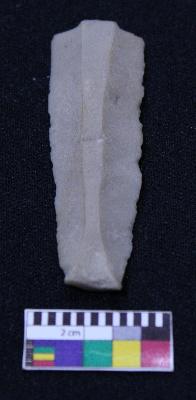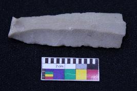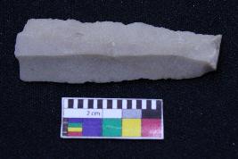 | Description / विवरण | Fragment of blade is having positive bulb of percussion at one end, other end is broken, retouched sides and ridges on the top. |