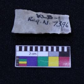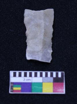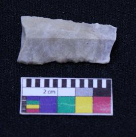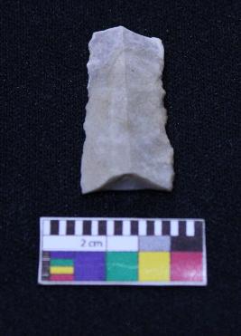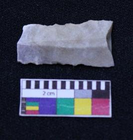 | Description / विवरण | Fragment of blade is off white in color, having both ends broken, retouched sides, mid ridge on the top and triangular section. |