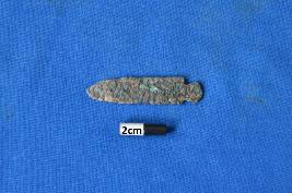 | Description / विवरण | An intact blade of copper with a patinated surface and a tang for hafting on one end and pointed from the other. |