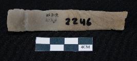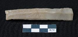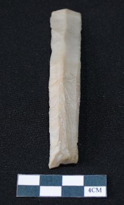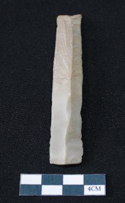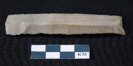 | Description / विवरण | Fragment of blade is dull brown in color, having smooth body, one end broken, retouched sides, mid ridge on the top and triangular section. |