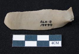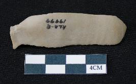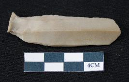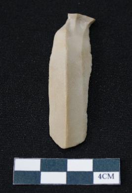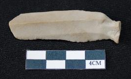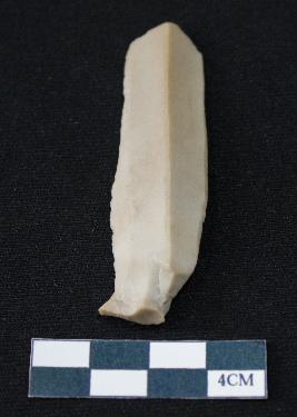 | Description / विवरण | Fragment of blade is dull brown in color, having smooth long body, positive bulb of percussion at one end, other end is broken, retouched sides, mid ridge on the top and triangular section. |