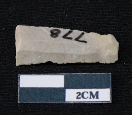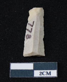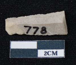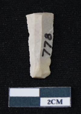 | Description / विवरण | Fragment of blade is white in color, having one end broken, sides are retouched, ridges on the top and triangular section. |