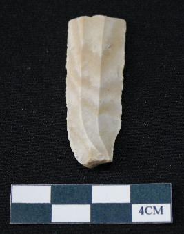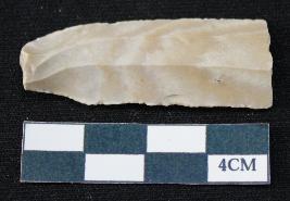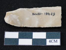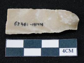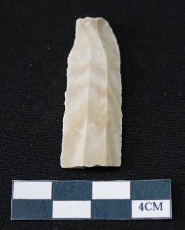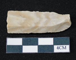 | Description / विवरण | Fragment of blade is off white in color, having positive bulb of percussion at one end, other end is broken, smooth body, sides are retouched and ridges on the top. |