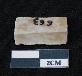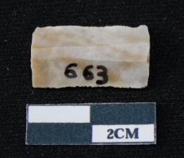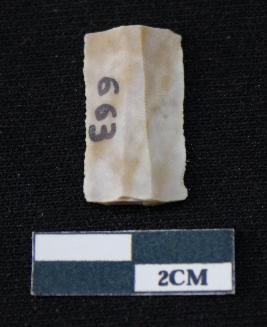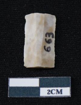 | Description / विवरण | Fragment of blade is white in color, having both ends broken, retouched sides, ridges on the top. and triangular section. |