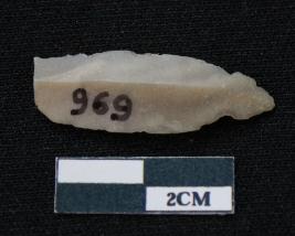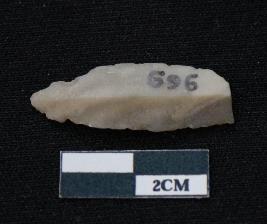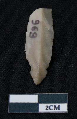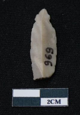 | Description / विवरण | Fragment of blade is off white in color, having one end broken, other end is pointed, retouched sides, mid ridges on the top and triangular section. |