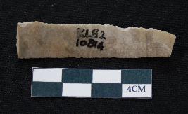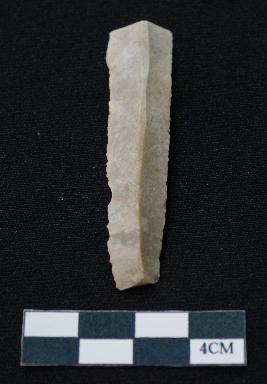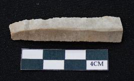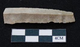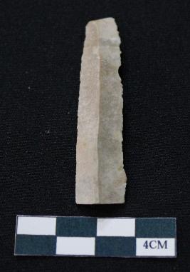 | Description / विवरण | Fragment of blade is dull brown in color, having long body, one end broken, sides are retouched, mid ridge on the top and triangular section. |