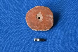 | Description / विवरण | A terracotta spindle whorl with unfinished corners and a hole in the middle. The fabric used is red slipped ware. |