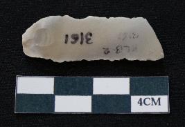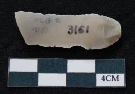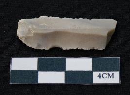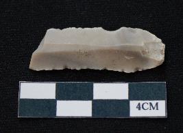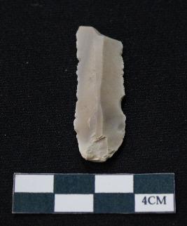 | Description / विवरण | Fragment of blade is white in color, having positive bulb of percussion at one end, other end is broken, sides are retouched, mid ridge on the top and triangular section. |