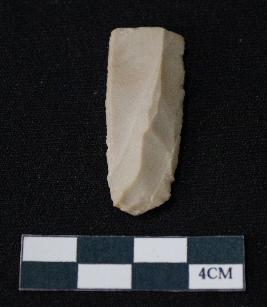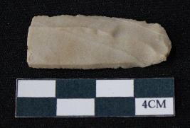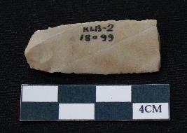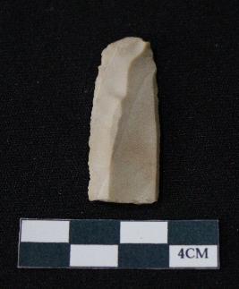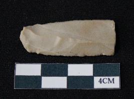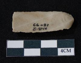 | Description / विवरण | Fragment of blade is off white in color, having smooth body, positive bulb of percussion at one end, other end is broken, sides are retouched, mid ridge on the top and triangular section. |