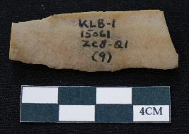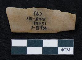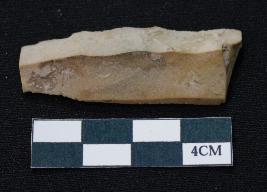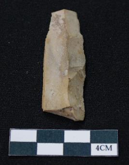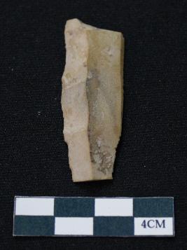| Description / विवरण | Fragment of blade is made of stone having one end broken, one side is retouched, other side has no retouching, mid ridge on the top and triangular section. |