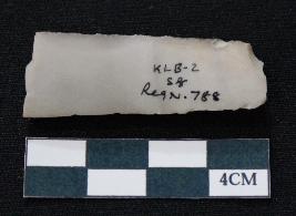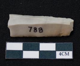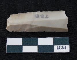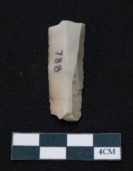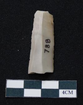| Description / विवरण | Fragment of blade is off white in color, having one end broken, sides are retouched, ridges on the top and triangular section. |