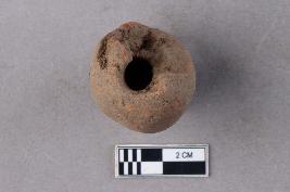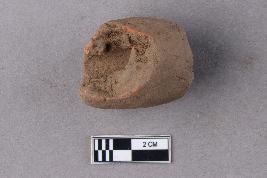 | Description / विवरण | A large barrel-shaped bead of terracotta with central perforation. It is broken and reddish in colour. |
