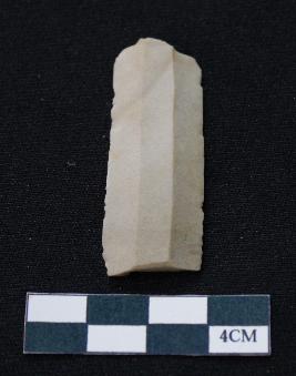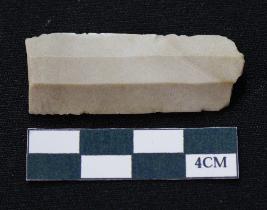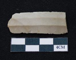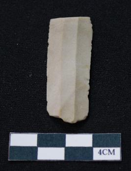 | Description / विवरण | Fragment of blade is off white in color, having both ends broken, sides are retouched, ridges on the top and thin section. |