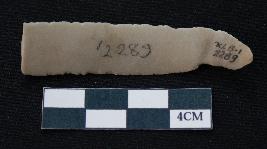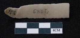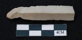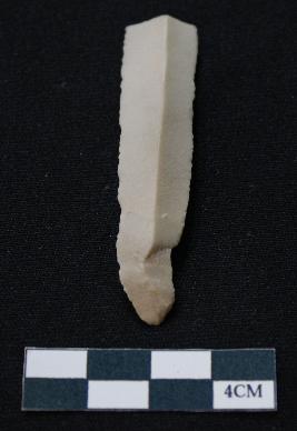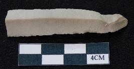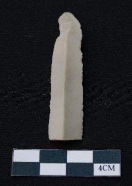 | Description / विवरण | Fragment of blade is off white in color, having one end broken, other end is pointed, sides are retouched, mid ridge on the top and triangular section. |
