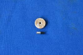 | Description / विवरण | A patinated disc shaped bead of shell with a smooth surface and a perforation at the center. |