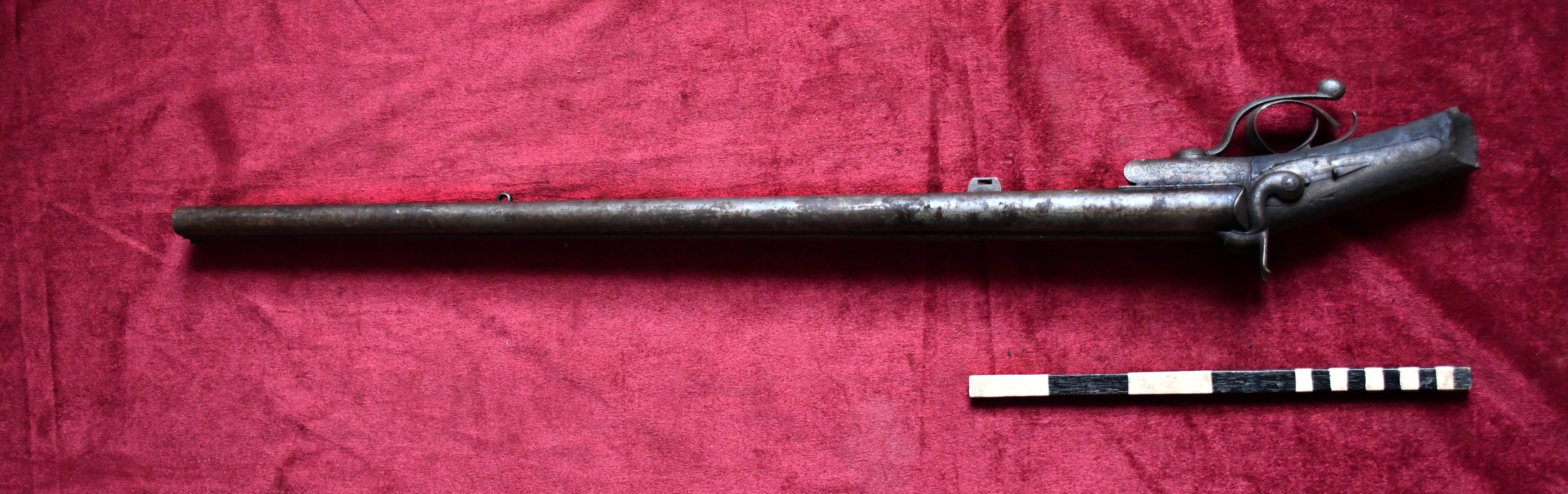 Breech loading flint - lock double barreled gun having engraved no. 2368 HS below the barrel. This is a gun having two barrel and this breech-loader is a firearm in which the user loads the ammunition (cartridge or shell) via the rear (breech) end of its barrel, as opposed to a muzzleloader, which loads ammunition via the front (muzzle).