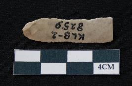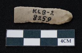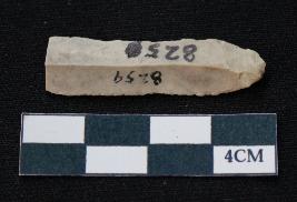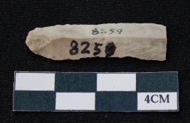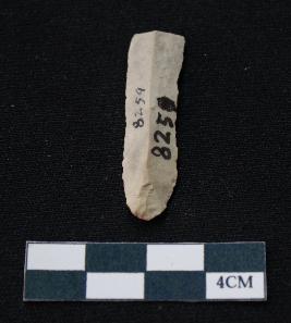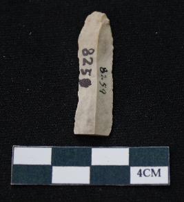 | Description / विवरण | Fragment of blade is off white in color, having one end broken, sides are retouched, mid ridge on the top and triangular section. |