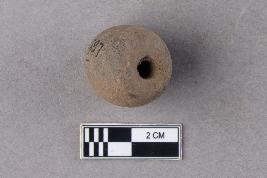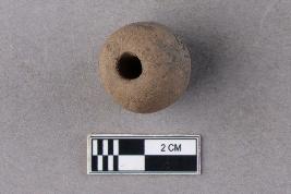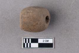 | Description / विवरण | A small, irregularly barrel-shaped bead of terracotta with a cylindrical central perforation. It is reddish in colour. |