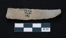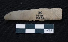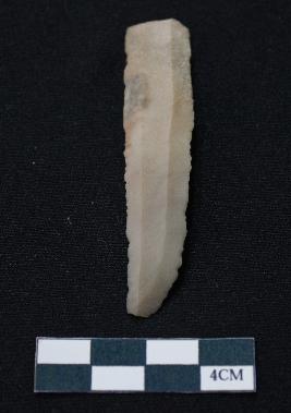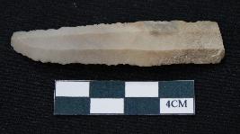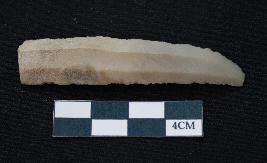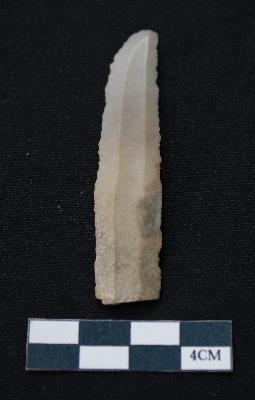 | Description / विवरण | Fragment of blade is dull brown in color, having one end broken, sides are retouched, ridges on the top and thin section. |