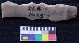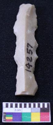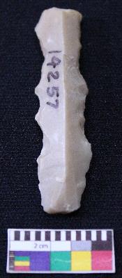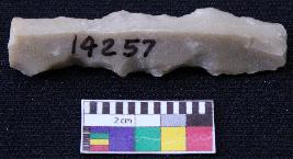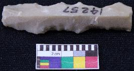 | Description / विवरण | Fragment of blade is brown in color, made of fine-grained stone, having positive bulb at one end, other end is broken, smooth body, retouched sides, mid ridge on the top and triangular section. |