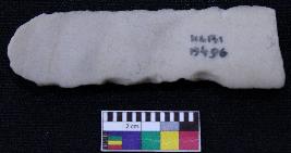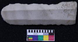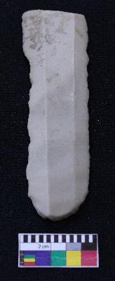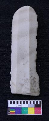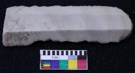 | Description / विवरण | Fragment of blade is off white in color, made of fine-grained stone, having one end broken, other end is curved, smooth body, retouched sides, ridges on the top and semi-circular section. |