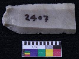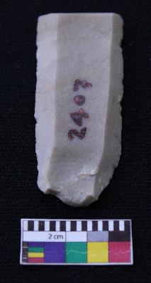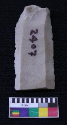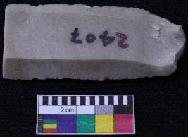| Description / विवरण | Fragment of blade is dull brown in color, made of fine-grained stone, having positive bulb of percussion at one end, other end is broken, retouched sides, ridges on the top and thin section. |