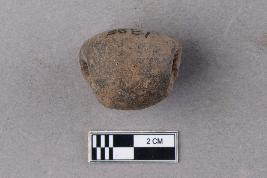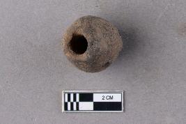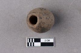 | Description / विवरण | An irregularly barrel-shaped terracotta bead with a central perforation. It is reddish to grey in appearance. |