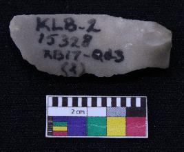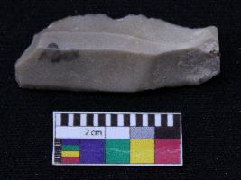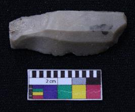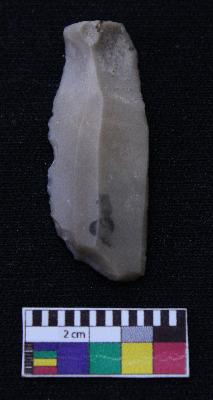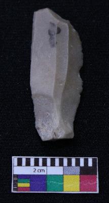 | Description / विवरण | Fragment of blade is dull brown in color, having positive bulb of percussion at one end, other end is broken, retouched sides, ridges on the top and triangular section. |