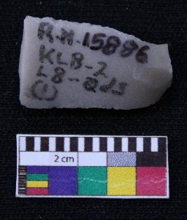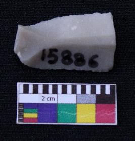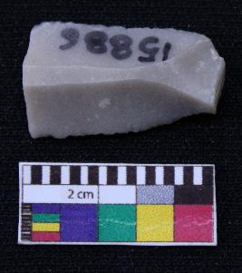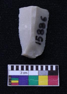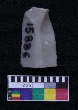 | Description / विवरण | Fragment of blade is off white in color, having positive bulb of percussion at one end, other end is broken, retouched sides, ridges on the top and triangular section. |