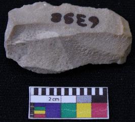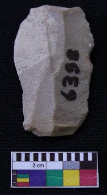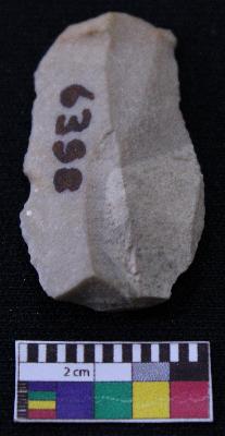 | Description / विवरण | Fragment of blade is having positive bulb of percussion at one end, other end is broken, retouched sides, mid ridge on the top and triangular section. |