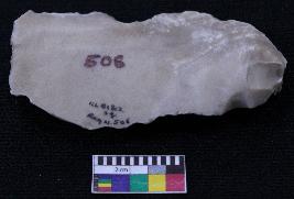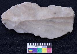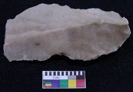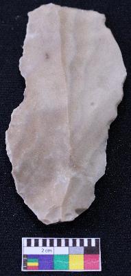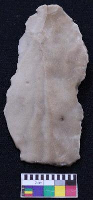 | Description / विवरण | Fragment of blade is dull brown in color, having positive bulb of percussion at one end, other end is broken, retouched sides, mid ridge on the top and triangular section. |