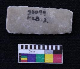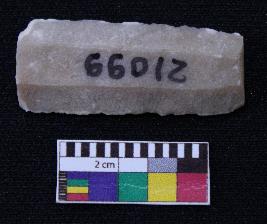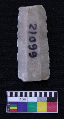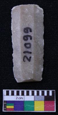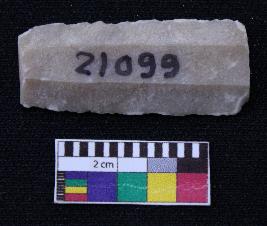 | Description / विवरण | Fragment of blade is having one end broken, retouched parallel sides, ridges on the top and thin section. |