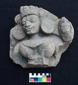 | Description / विवरण | This represents the damaged bust of female figure. From the middle part of chest, the entire lower portion is found to be missing. Of two hand, right one is mutilated from near the shoulder, while the left hand is visible up to upper half. Her left hand is holding a container. The figures are beautified by some essential elements like tiara on head, big tilak marks on forehead, round puspa-kundalas in the ears, and numbers of necklaces, which are minutely carved out. |