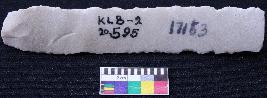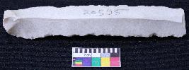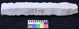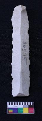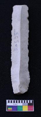 | Description / विवरण | Fragment of blade is off white in color, having positive bulb of percussion at one end, other end is broken, retouched sides, mid ridge on the top and triangular section. |