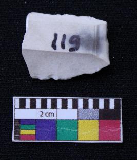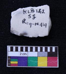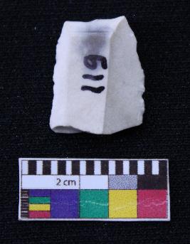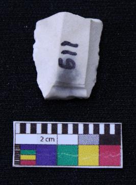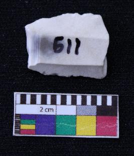 | Description / विवरण | Fragment of blade is white in color, having positive bulb of percussion at one end, other end is broken, retouched sides and ridges on the top. |