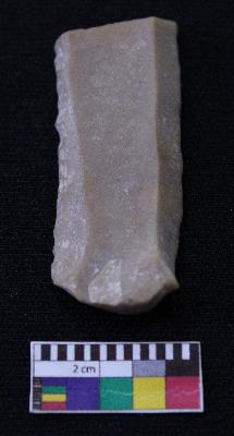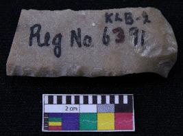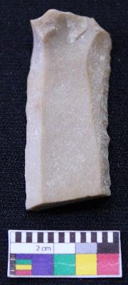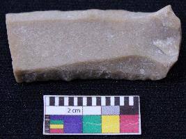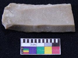 | Description / विवरण | Fragment of blade is dull brown in color, having positive bulb of percussion at one end, other end is broken, retouched sides and ridges on the top. |