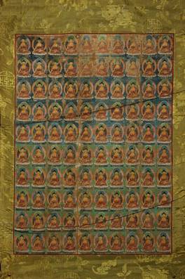 | Description / विवरण | Mounted on a green coloured Chinese silk brocade, the thangka features a panel of hundred Shakyamuni Buddhas in Bhumisparsha mudra. |