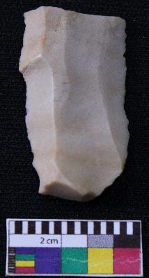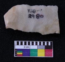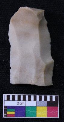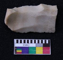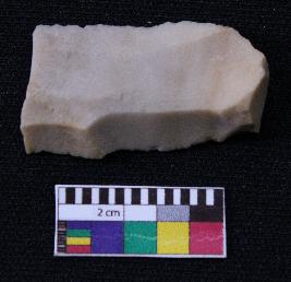 | Description / विवरण | Fragment of blade is off white in color, having smooth body, positive bulb of percussion at one end, other end is broken, retouched sides, mid ridge on the top and triangular section. |
