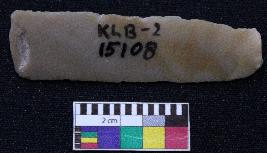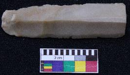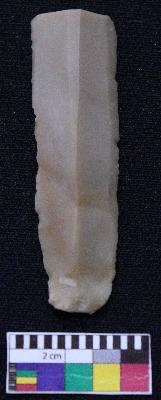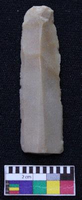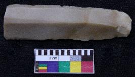 | Description / विवरण | Fragment of blade is brown in color, having positive bulb of percussion at one end, other end is broken, retouched sides, mid ridge on the top and triangular section.. |