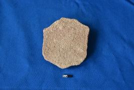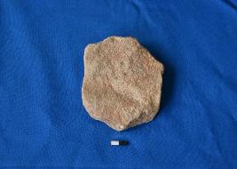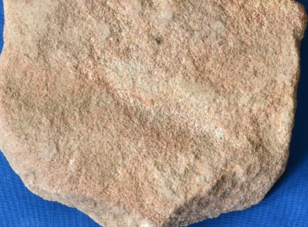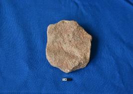 Roughly circular in shape and has a depression which shows it was used for polishing. One side is flat and the other side has an undulated surface, the texture of the sandstone is grainy and it is pink in colour.