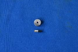 | Description / विवरण | A disc shaped bead of shell in white colour with charring on the surface and a perforation at the center. |