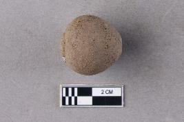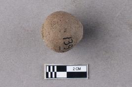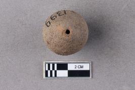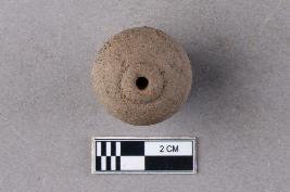 | Description / विवरण | An areca nut bead of terracotta. It is top-drilled and centrally perforated. The perforation towards the wider end is surrounded by a deep groove. The drill pattern is conical within the bead. It is reddish in colour. |