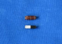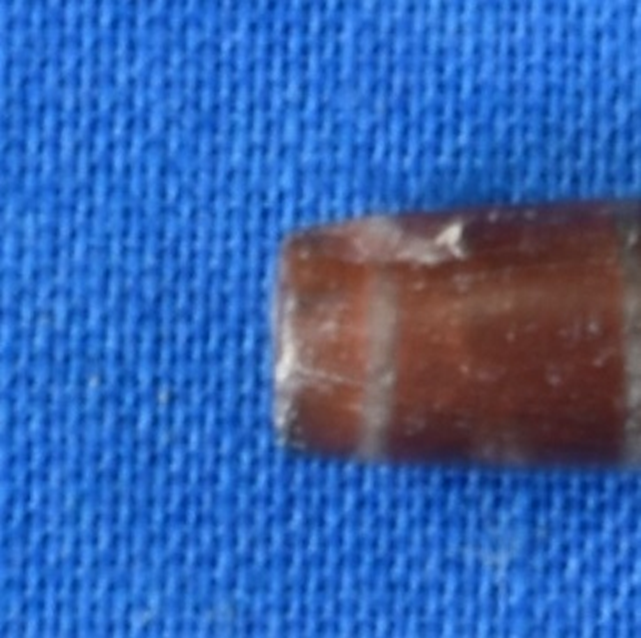 Cylindrical shaped etched carnelian bead in brown colour with three parallel lines etched on the surface and a perforation at the center.