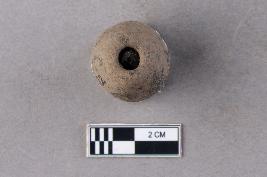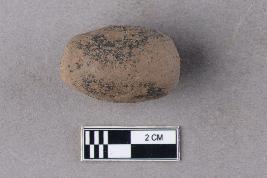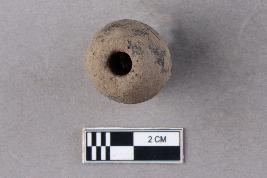 | Description / विवरण | An irregularly long barrel-shaped terracotta bead with central perforation. It appears to be handmade and is grey in colour. |