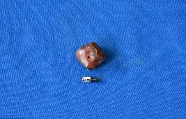 | Description / विवरण | A square shaped biconical bead of carnelian in brown colour with an unfinished surface and perforation at the center. |