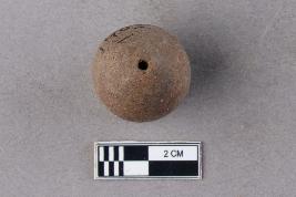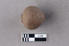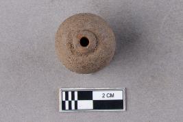 | Description / विवरण | An areca nut bead of terracotta. It is top-drilled and centrally perforated. The perforation towards the wider end is surrounded by a deep groove. The drill pattern is conical within the bead. It is reddish in colour. |